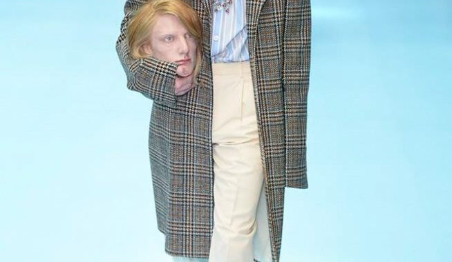 Nas passarelas da Gucci essa questão sobre os gêneros já é compreendida logo na abertura, com a entrada de um modelo de terno e cabelos longos, em que é difícil identificar seu gênero (foto 1), aqui surge como uma provocação do estilista ao espectadores sobre a real necessidade de saber essa informação. Outros símbolos são levantados para reforçar essa premissa, como lenços, turbantes e máscaras, que remetem a religião, para colocar a figura do ciborgue não somente como sem gênero, mas também sem religião.